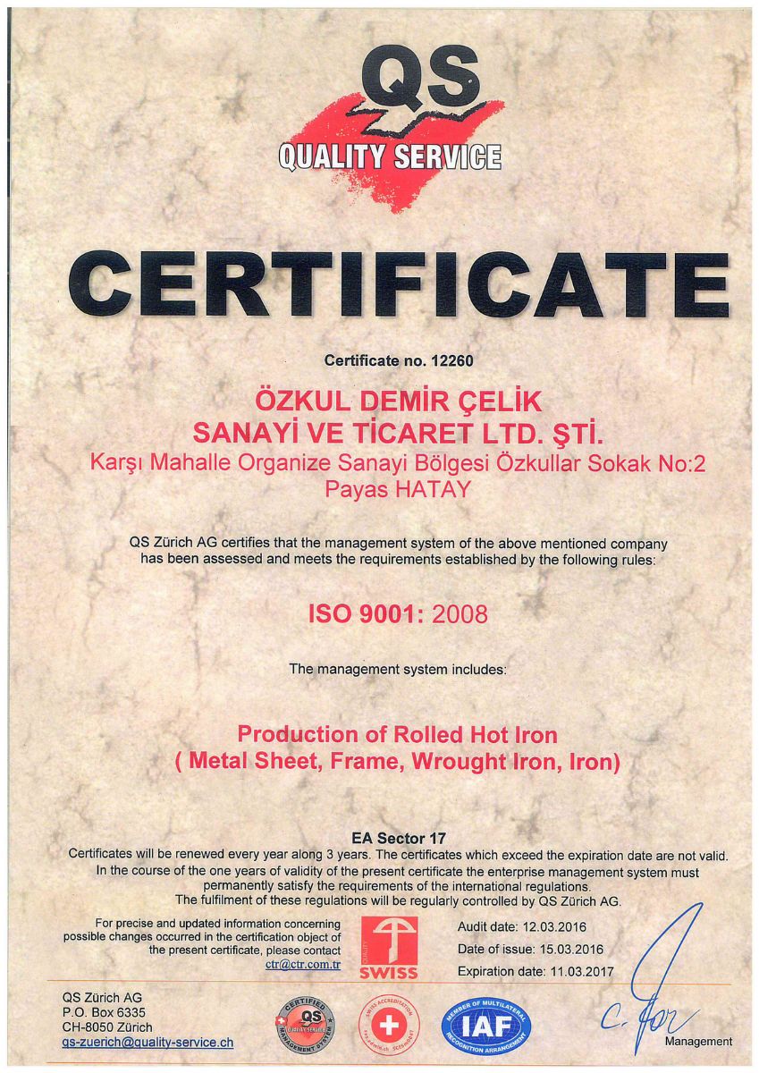 ÖZKUL DEMİR ÇELİK SAN.VE TİC.LTD.ŞTİAdres : Organize Sanayi Bölgesi Özkullar Sk.No:2 / HATAY / Payas